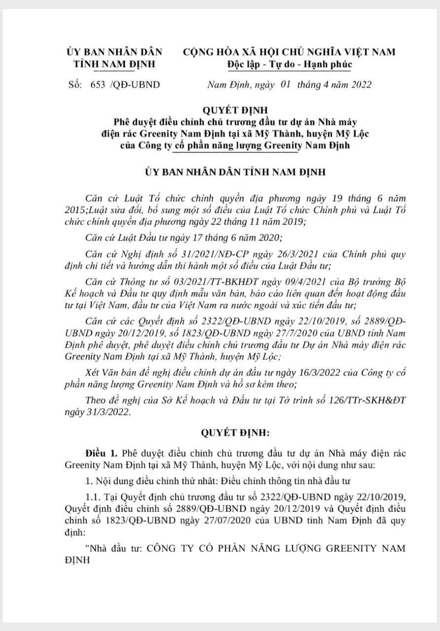 Sáng nay, 4/4, Văn phòng UBND tỉnh Nam Định phát đi văn bản quyết định của UBND tỉnh, do Phó Chủ tịch Thường trực Trần Anh Dũng ký, về phê duyệt điều chỉnh chủ trương đầu tư dự án Nhà máy điện rác Greenity Nam Định tại xã Mỹ Thành, huyện Mỹ Lộc của Công ty CP năng lượng Greenity Nam Định.