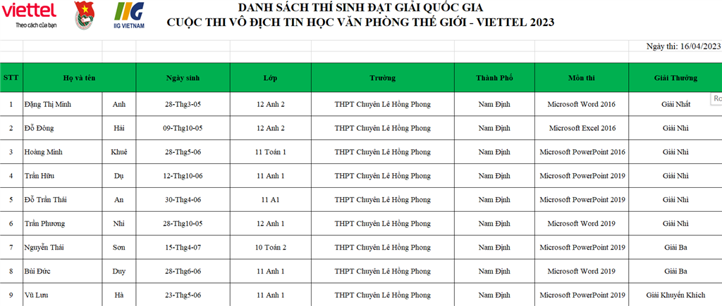 Ngày 23/5, thông tin tới Đại Đoàn Kết Online, lãnh đạo UBND tỉnh Nam Định cho biết, tỉnh đã nhận được thông báo kết quả Cuộc thi Vô địch Tin học văn phòng Thế giới - Viettel 2023 (MOS World Championship - Viettel 2023) của Ban tổ chức.