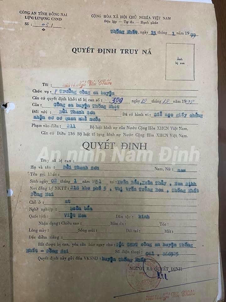 Tuy nhiên, mới đây, qua công tác quản lý cư trú trên địa bàn, Công an xã Yên Bằng phát hiện ông Sơn, nay đã 70 tuổi chính là đối tượng bị Công an huyện Thống Nhất truy nã từ 22 năm trước.