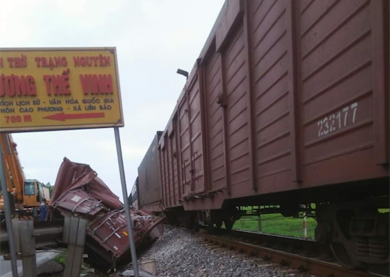 Nam Định: Xe container chồm lên đường ray ‘gặp’ tàu hoả