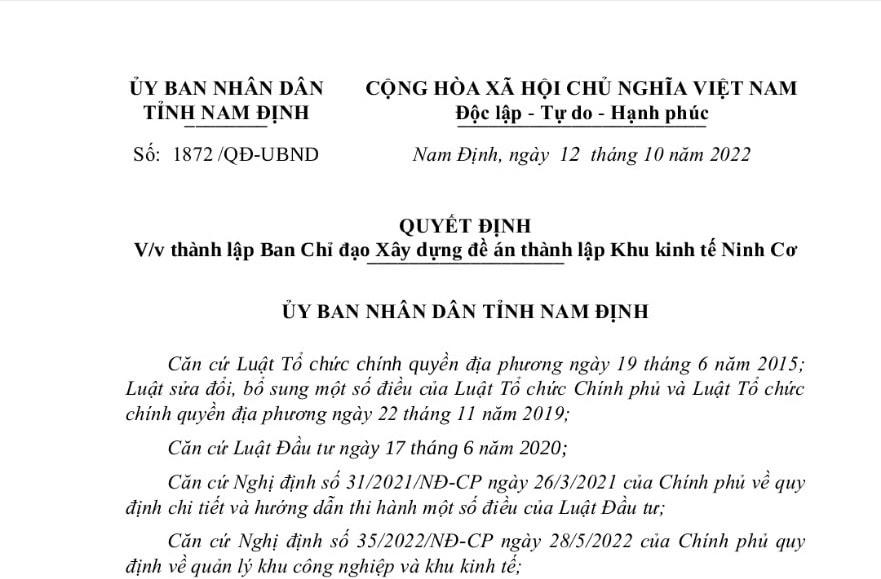 Theo nội dung văn bản, UBND tỉnh Nam Định quyết định thành lập Ban Chỉ đạo Xây dựng đề án thành lập Khu kinh tế Ninh Cơ của tỉnh, với Trưởng ban là Chủ tịch UBND tỉnh, Phó Trưởng ban Thường trực là Phó Chủ tịch Thường trực UBND tỉnh; hai Phó Trưởng ban khác là Giám đốc Sở Kế hoạch và Đầu tư và Trưởng Ban Quản lý các khu công nghiệp tỉnh.