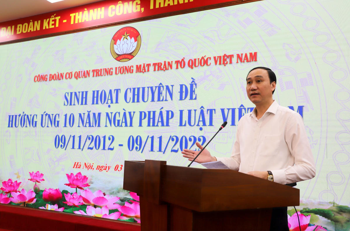 Ngày 3/11, tại Hà Nội, Công đoàn Cơ quan Trung ương MTTQ Việt Nam đã tổ chức sinh hoạt chuyên đề hưởng ứng Ngày Pháp luật Việt Nam (9/11/2012 - 9/11/2022). Ông Phùng Khánh Tài, Phó Chủ tịch UBTƯ MTTQ Việt Nam, Chủ tịch Công đoàn Cơ quan dự và phát biểu tại buổi sinh hoạt.