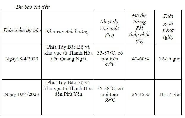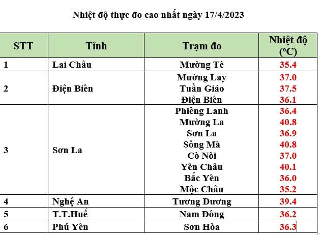 Theo Trung tâm, khu vực Tây Bắc Bắc Bộ đã có nắng nóng, có nơi nắng nóng gay gắt với nhiệt độ cao nhất ngày 17/4 phổ biến khoảng 35-37 độ, có nơi trên 37 độ như: Tuần Giáo (Điện Biên) 37.5 độ, Sông Mã (Sơn La) 40.8 độ; Khu vực từ Thanh Hóa đến Phú Yên có nắng nóng cục bộ với nhiệt độ cao nhất ngày 17/4 ở một số nơi như: Tương Dương (Nghệ An) 39.4 độ, Nam Đông (Thừa Thiên Huế) 36.2 độ, Sơn Hòa (Phú Yên) 36.3 độ,…