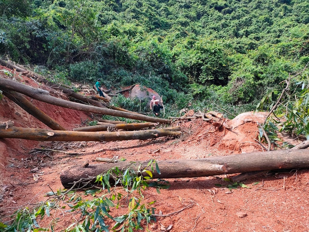 Theo người dẫn đường, khu vực này có 3 chủ rừng là bà Phan Thị Hiền, Nguyễn Phi Tùng, Phạm Ngọc Thắng (đều trú tại xã Đỉnh Bàn) với tổng diện tích 27,2 ha. Đường lên khai thác rừng rộng chừng 3 m, được máy đào khoảng 1 tháng nay, đi xuyên qua phần đất rừng của 3 hộ nói trên. Ngoài đường chính, ở mỗi phần đất của các hộ còn có nhiều đường phụ được phát mở ngang dọc, tứ tung trông hết sức nham nhở.