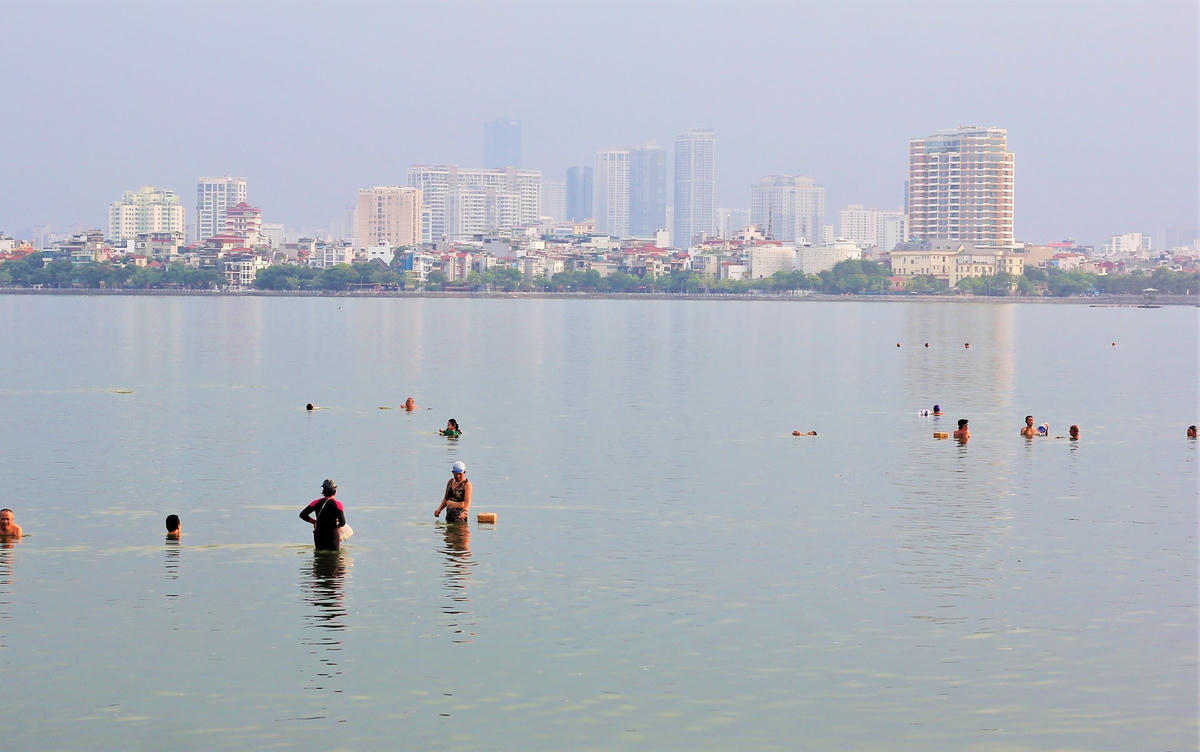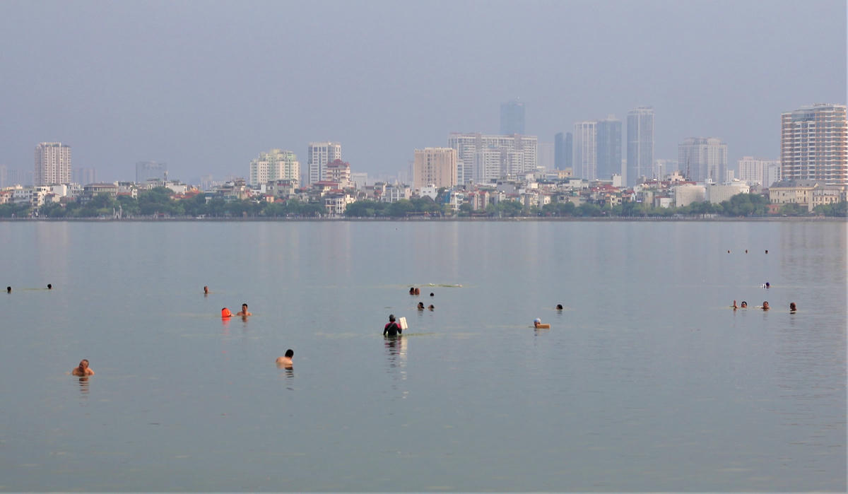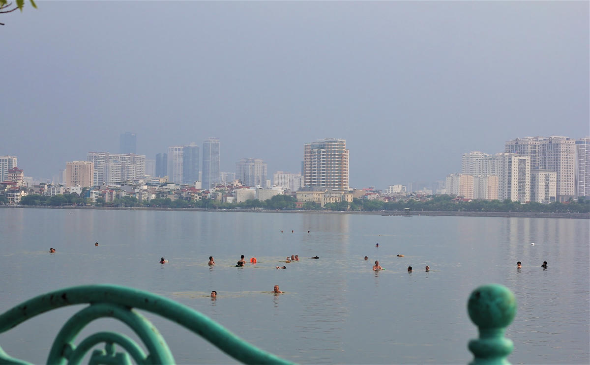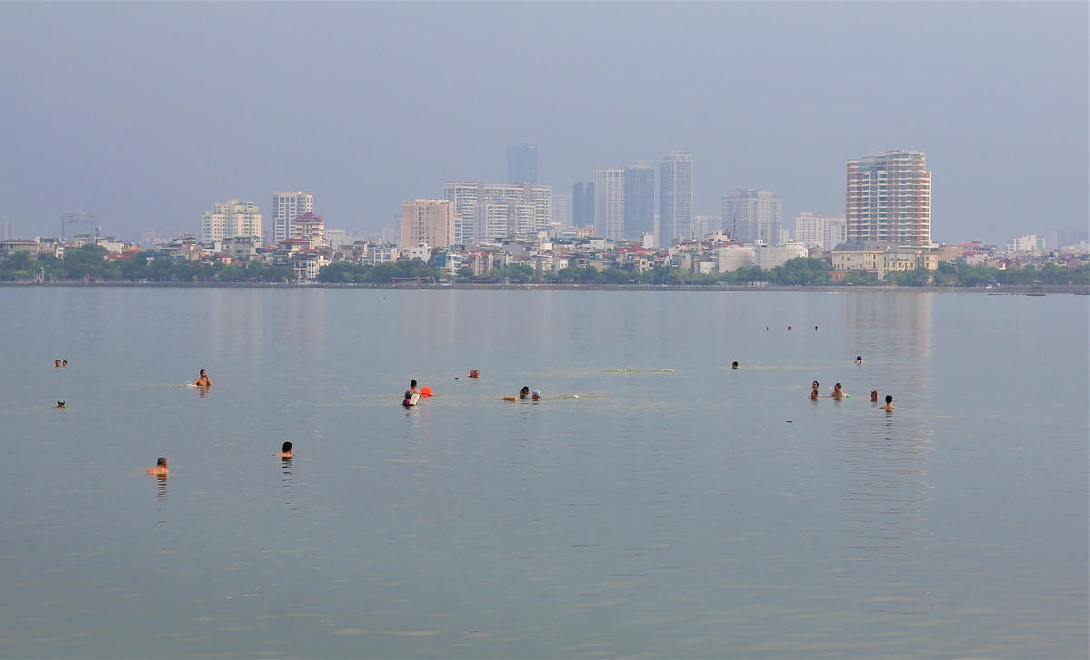 Thời tiết nắng nóng liên tục kéo dài, rất đông người dân ở Hà Nội kéo nhau ra Hồ Tây “giải nhiệt” mặc cho các biển “Cấm tắm” được cắm ven đường.