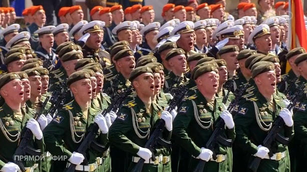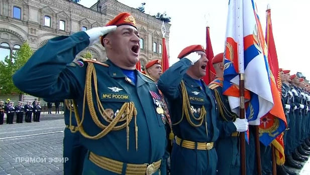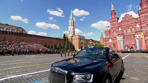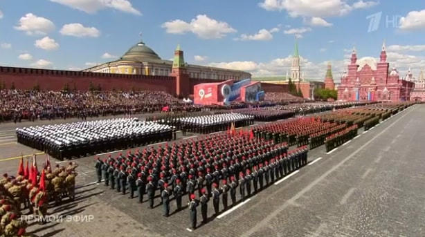 Lễ duyệt binh ngày 9/5 đánh dấu 78 năm kể từ khi Đức Quốc xã đầu hàng Liên Xô trong Chiến tranh thế giới thứ hai. Theo truyền thống, buổi lễ khai mạc với đội danh dự mang biểu ngữ giương cao trên đỉnh Reichstag vào ngày 2/5/1945, lá cờ chiến đấu của Sư đoàn bộ binh 150.