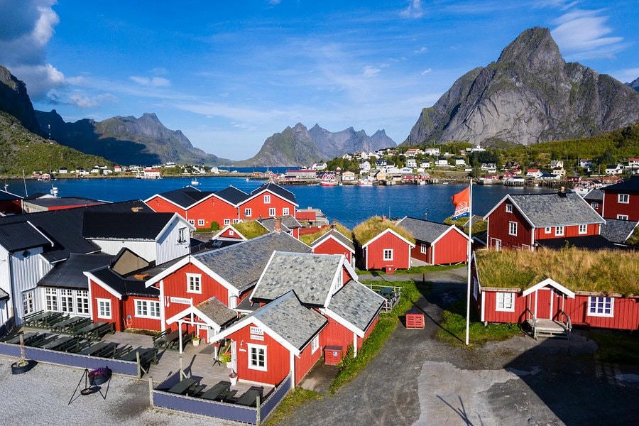 Tại Reine, luôn có những chiếc cabin màu đỏ xinh xắn nằm dưới chân những đỉnh núi cheo leo khiến nơi đây trở thành một điểm đến lý tưởng.