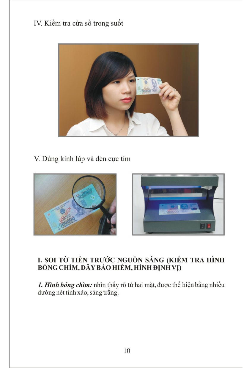 Thứ hai, có thể soi tờ tiền trước nguồn sáng, kiểm tra hình bóng chìm và hình định vị: Hình bóng chìm (bên trái mặt trước hoặc bên phải mặt sau tờ tiền): Nhìn thấy rõ từ hai mặt tờ tiền, được thể hiện bằng nhiều đường nét tinh xảo và sáng trắng. Đối với mệnh giá từ 20.000đ đến 500.000đ là hình ảnh chân dung Chủ tịch Hồ Chí Minh; mệnh giá 10.000đ là hình ảnh chùa Một Cột.