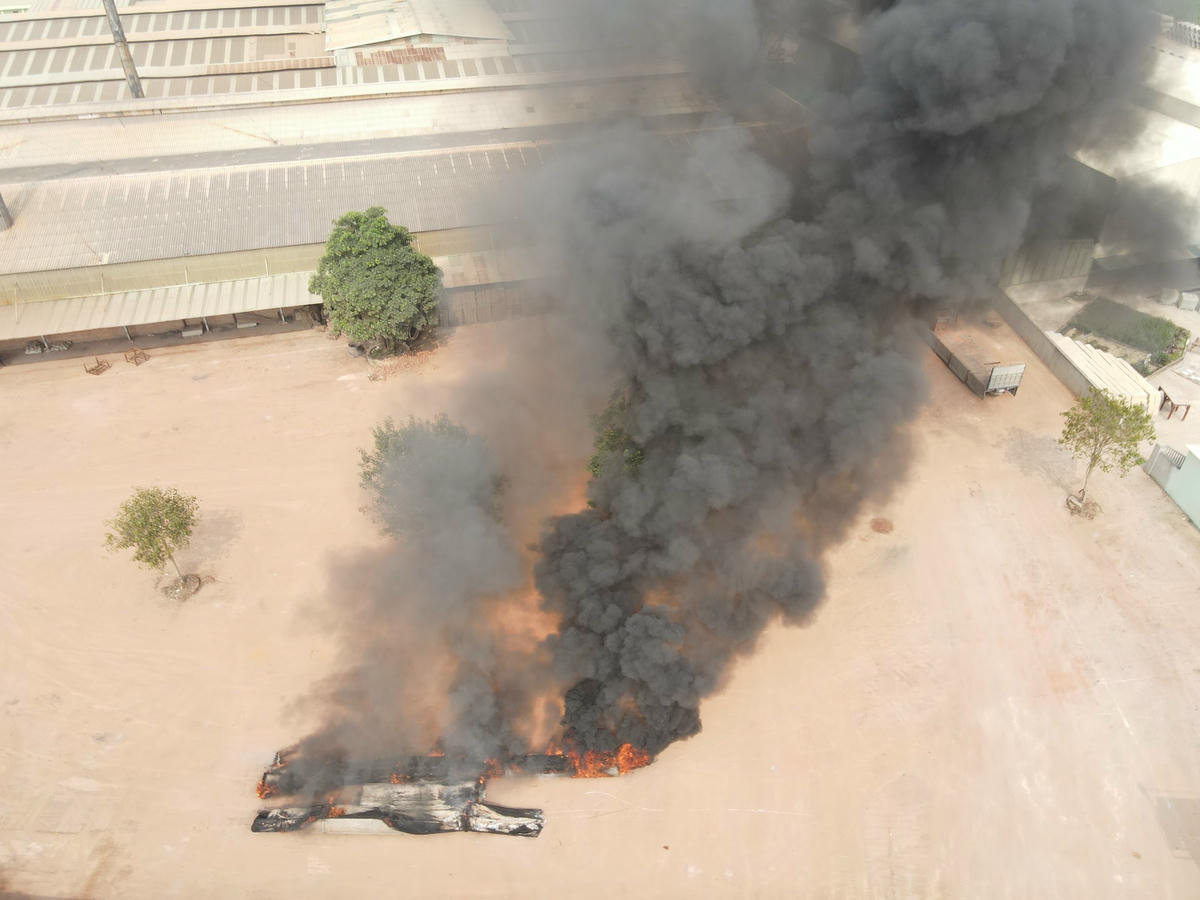 Khi xác định được nơi cháy là trong khuôn viên Nhà máy gạch Phú Thịnh, chúng tôi sử dụng flycam để quan sát thì xác định vật đang cháy là cao su.