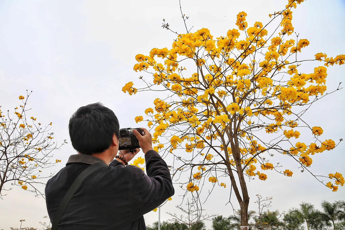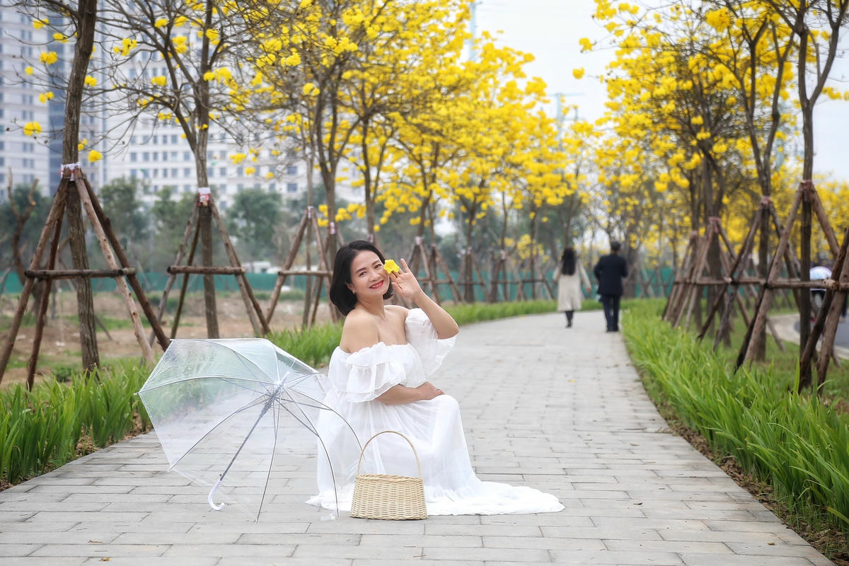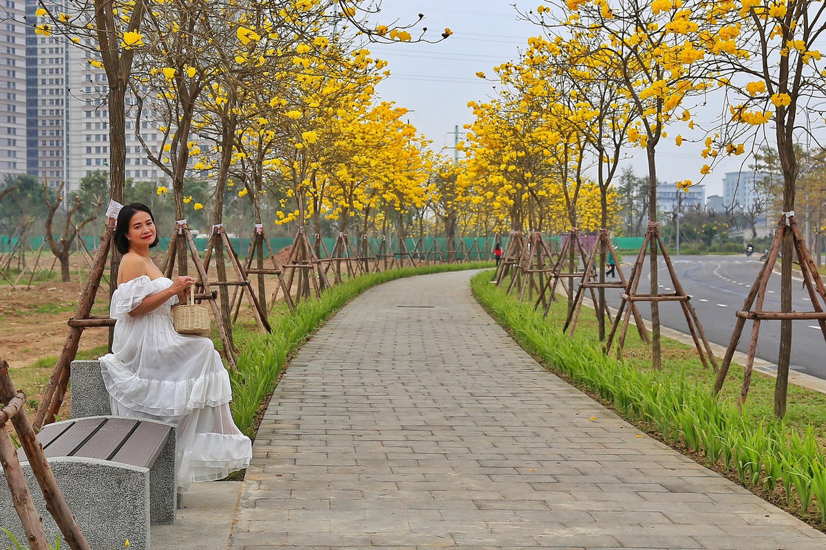 Con đường dài khoảng 800 m, được trồng 4 hàng cây phong linh ở 2 bên vỉa hè.Cây phong linh nở hoa vào mùa xuân từ tháng 2 đến tháng 5, khi nở, những chùm hoa đẹp phủ khắp tán cành, nối tiếp nhau mang tới vẻ đẹp khiến nhiều người say đắm.Cây phong Linh (còn gọi là cây chuông vàng) có nguồn gốc từ khu vực Nam Mỹ và khu cận bìa rừng Amazon. Loại cây hoa công trình đẹp này thích hợp với khu vực có khí hậu nhiệt đới gió mùa (nơi khí hậu có 4 mùa rõ rệt) và cận ôn đới như Brazil, Paraguay và Bắc Argentina, Suriname, Đông Bolivia, Peru...Ở khu vực châu Á, cây chuông vàng phân bố ở nhiều quốc gia như Trung Quốc, Philippines, Thái Lan...Theo tìm hiểu, hoa phong linh bắt đầu du nhập vào Việt Nam từ những năm 2000 đã nhanh chóng được yêu thích bởi đặc tính sinh trưởng tốt, vẻ đẹp tự nhiên rực rỡ.Hoa phong linh mọc thành cụm có hình giống như chiếc chuông. Khi hoa nở, lá cây đã rụng hết, những chùm hoa rực rỡ sẽ bao trùm cả tán cây, khoe trong trong tiết trời mùa Xuân.Ngay sau khi thấy con đường hoa vàng trên mạng xã hội, Chị Thùy An đã ngay lập tức chuẩn bị váy áo thật đẹp để đến chụp ảnh với con đường hoa phong linh này."Năm ngoái bị lỡ hẹn do phải đi công tác nên năm nay sau khi nhìn thấy hình ảnh hoa phong linh nở rộ tôi đã ngay lập tức tìm thợ chụp ảnh, lên ý tưởng để chụp được những bức ảnh đẹp của mùa Xuân", chị Thùy An cho hay.Nhiều nhiếp ảnh gia mê hoa cũng đã có mặt để sáng tạo những bức ảnh đẹp về loài hoa này.