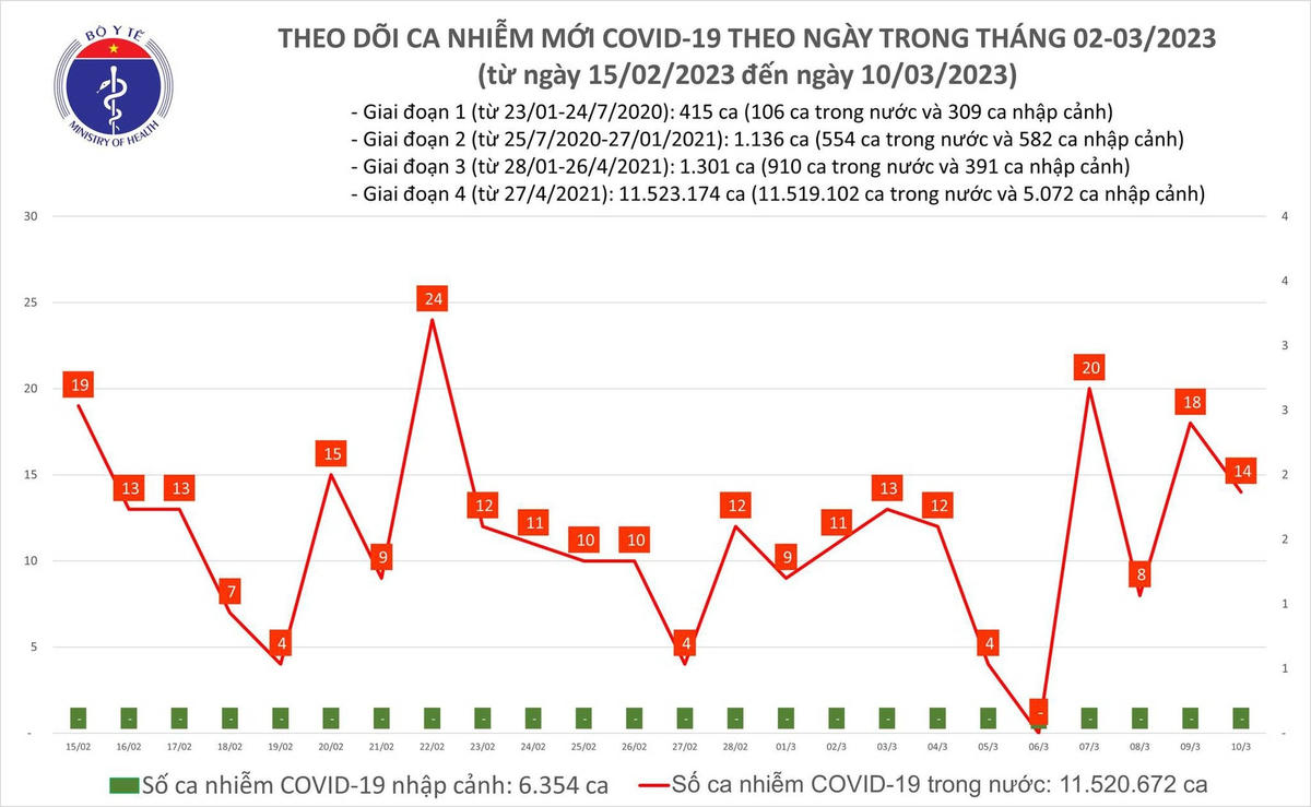 Bản tin phòng chống dịch Covid-19 ngày 10/3 của Bộ Y tế cho biết có 14 ca mắc mới, giảm nhẹ so với hôm qua. Trong ngày có 6 bệnh nhân khỏi. Đặc biệt, hiện cả nước chỉ còn 1 bệnh nhân Covid-19.nặng.