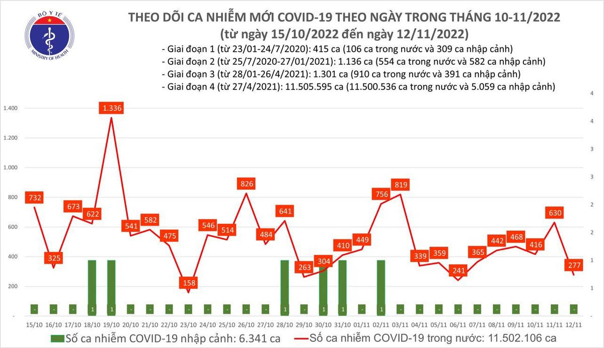 Bản tin về phòng chống dịch Covid-19 ngày 12/11 của Bộ Y tế cho biết có 277 ca mắc Covid-19, giảm gần 400 ca so với hôm qua; bệnh nhân nặng tăng lên 68 trường hợp; tiếp tục không có bệnh nhân tử vong.