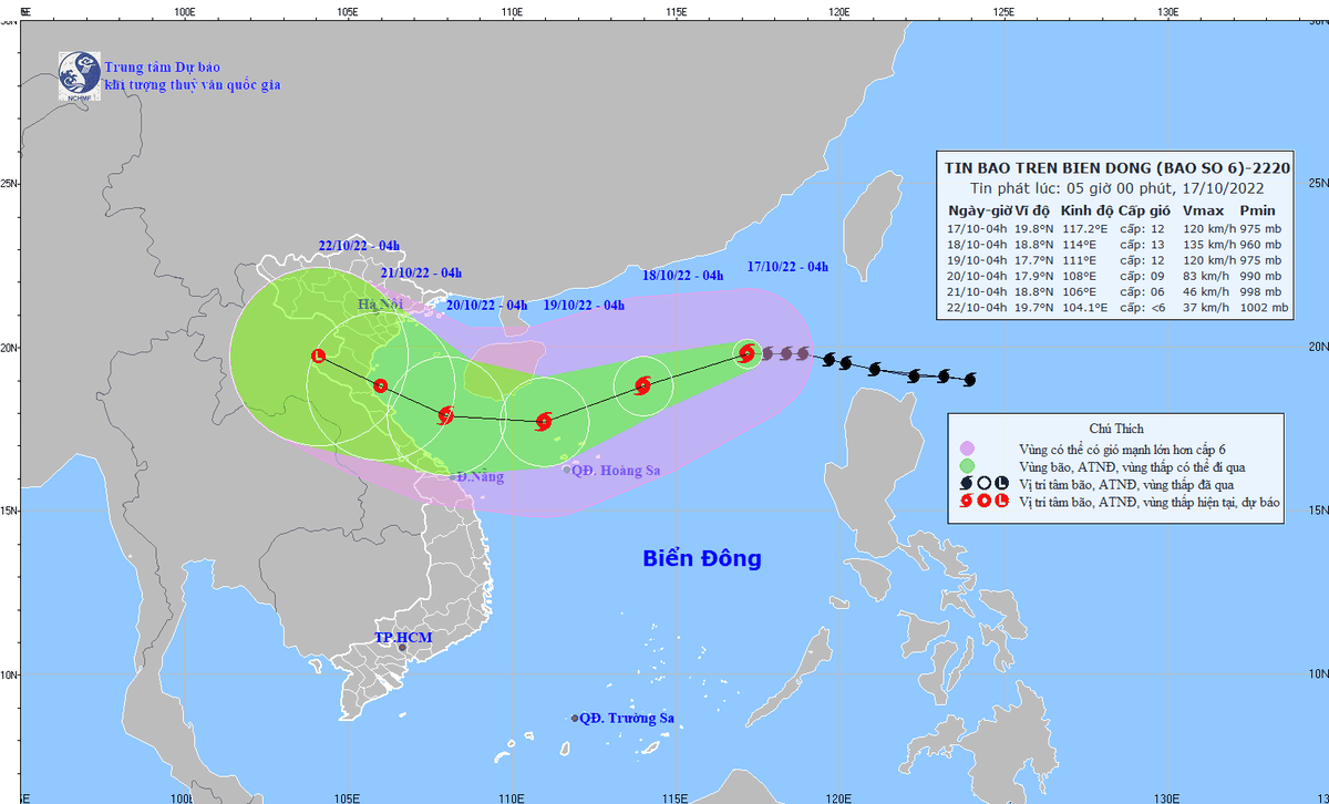 Về tin bão số 6, Trung tâm cho biết: 4h ngày 17/10, vị trí tâm bão ở vào khoảng 19,8 độ Vĩ Bắc; 117,2 độ Kinh Đông, cách quần đảo Hoàng Sa khoảng 720 km về phía Đông Bắc.