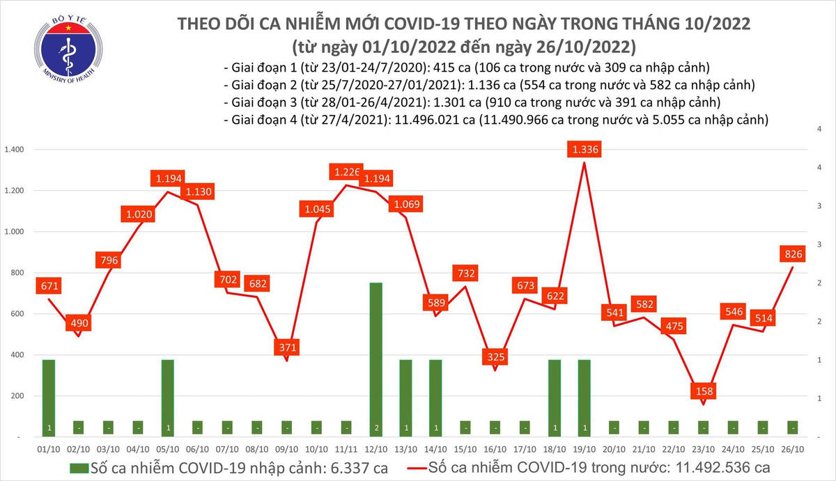 Bản tin phòng chống dịch Covid-19 ngày 26/10 của Bộ Y tế cho biết, có 826 ca mắc Covid-19, tăng hơn 300 ca so với hôm qua. Trong ngày có 1 bệnh nhân tại Cần Thơ tử vong.