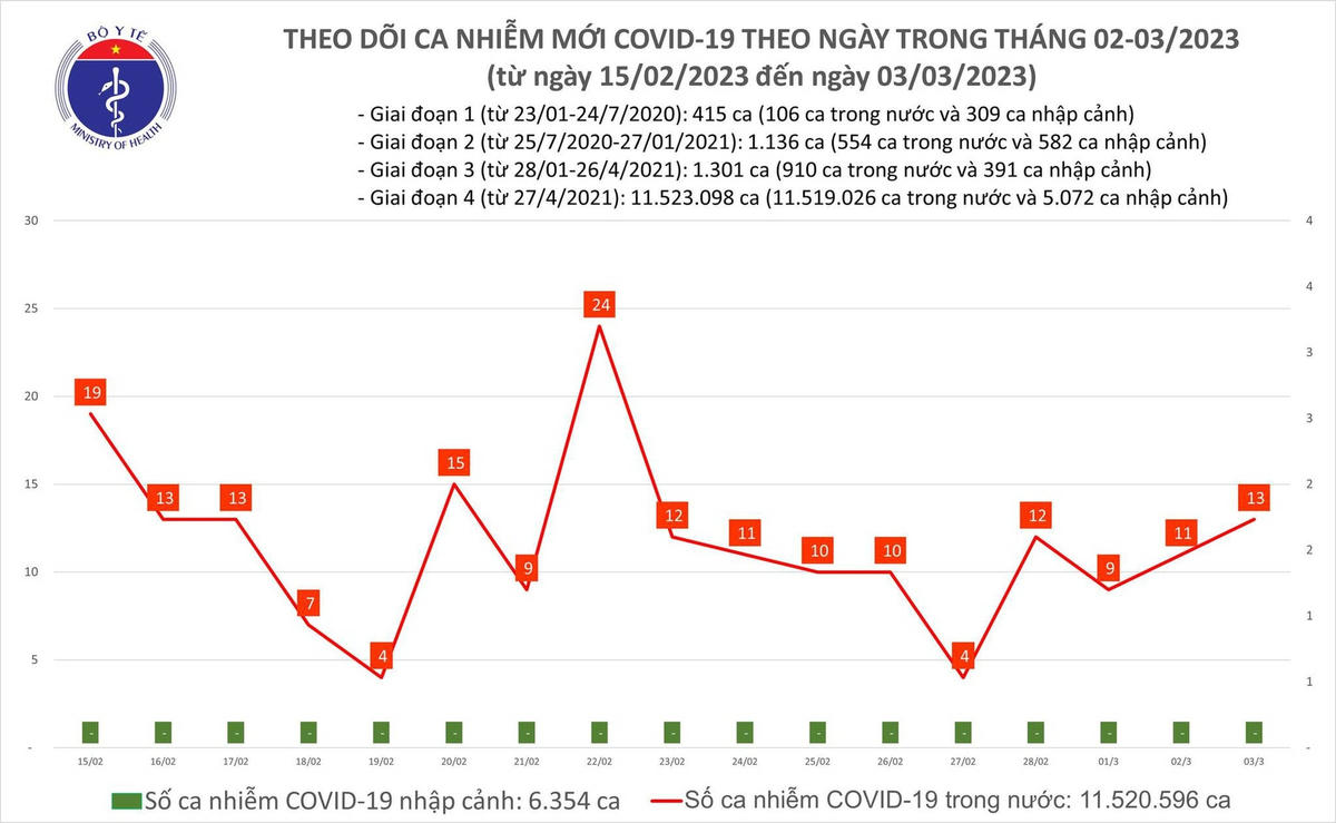 Bản tin phòng chống dịch Covid-19 ngày 3/3 của Bộ Y tế cho biết có 13 ca mắc Covid-19 mới, tăng nhẹ so với hôm qua và gấp gần 3 lần số bệnh nhân khỏi. Trong ngày có 4 bệnh nhân nặng đang điều trị.