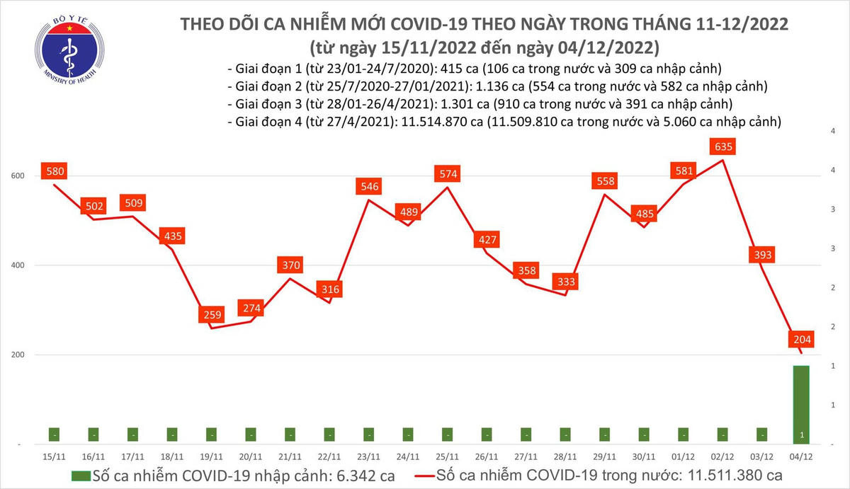 Bản tin phòng chống dịch Covid-19 ngày 4/12 của Bộ Y tế cho biết ca mắc Covid-19 giảm còn 204 ca, thấp nhất trong hơn 40 ngày qua.