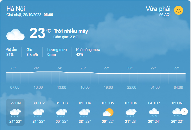 Hà Nội: Nhiều mây, có lúc mưa rào và dông. Gió đông bắc cấp 2-3. Nhiệt độ thấp nhất 23-25 độ C, cao nhất 25-27 độ C.