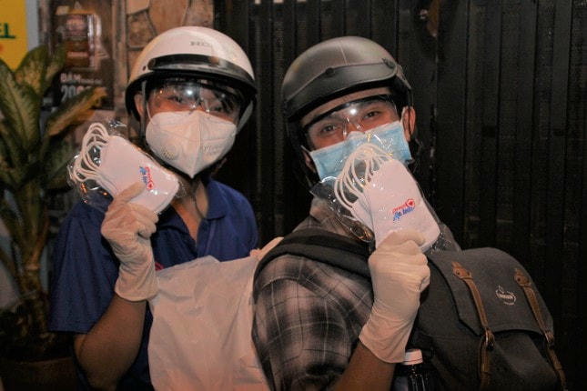 Gần 11h đêm, những ly cháo cùng các túi khẩu trang đã được đóng gọn gàng vào thùng xốp. Lúc này, cả đội phân chia thành các nhóm nhỏ để vận chuyển qua nhiều tuyến phố phát cho người dân.