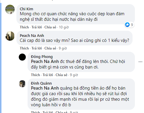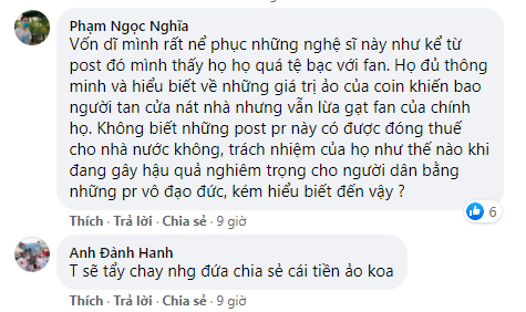 Ngay sau đó, nhiều trang cộng đồng đã lên tiếng cảnh báo người hâm mộ về việc đầu tư vào các đồng tiền ảo này. Bởi những gì các nghệ sĩ đăng trên trang cá nhân đơn giản là đã được phía Coin trả tiền quảng cáo. Thực tế, nhiều nghệ sĩ còn chẳng biết các định nghĩa về "tiền ảo" là gì, chỉ cần làm đúng theo yêu cầu của "đối tác" là có tiền.