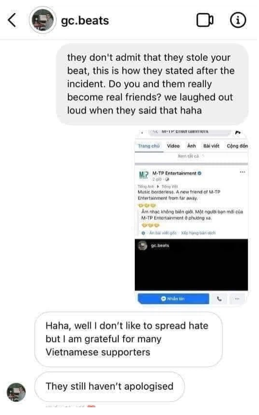 Cụ thể, theo nội dung bức ảnh trên, một tài khoản Instagram đã gửi cho producer bài đăng "Âm nhạc không biên giới. Một người bạn mới của công ty từ nơi rất xa" trên page M-TP Entertainment và đặt câu hỏi cho GC: "Họ không thừa nhận là họ đã ăn cắp beat của bạn, đây là cách mà họ trả lời sau vụ việc vừa qua. Bạn và họ có thực sự trở thành bạn không vậy? Chúng tôi cười rất nhiều khi đọc bài đăng này".