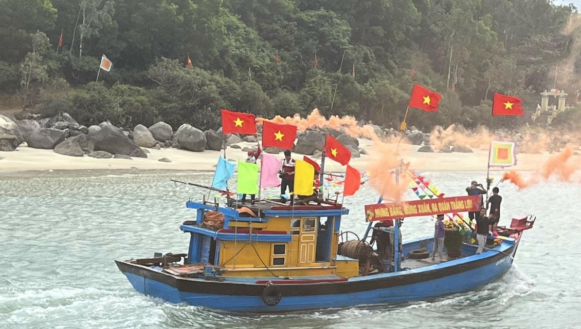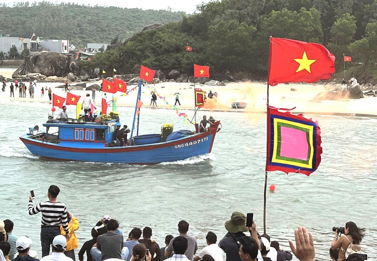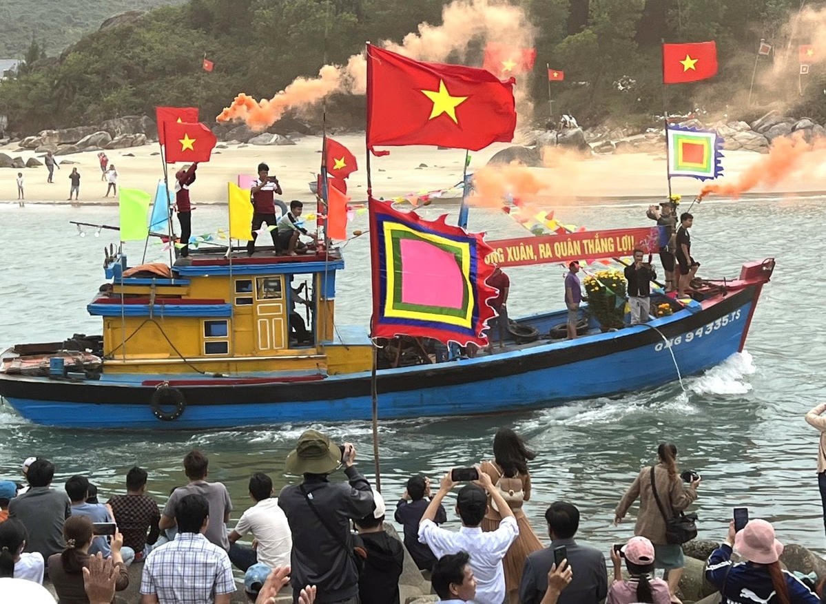 Tiếp đến, khi tiếng trống hiệu vừa kết thúc, 10 chiếc tàu nối đuôi nhau rú ga hướng thẳng ra cửa biển Sa Huỳnh mà tiến tới trước sự cổ vũ, hò reo của người dân đứng trên bờ. Những lá cờ Tổ quốc bay phấp phới trước gió và các câu khẩu hiệu như: “Mừng Đảng, mừng Xuân, ra quân thắng lợi”;… Qua đó làm tăng thêm niềm tin của ngư dân về một năm mới thắng lợi.