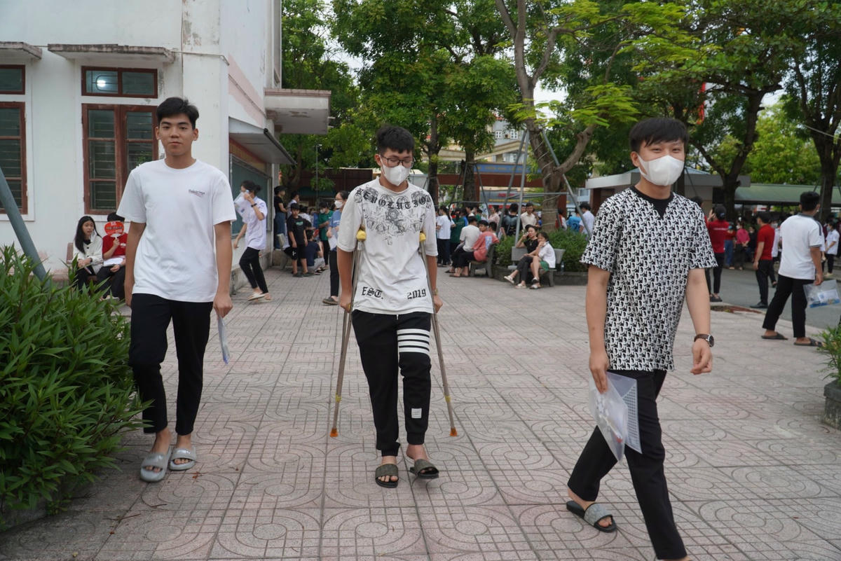 Trong số hàng nghìn thí sinh trên, tại điểm thi Trường Trung học phổ thông Phan Đình Phùng (TP Hà Tĩnh), em Trương Xuân Thành khác với những bạn khác khi tay chống nạng, chân trái co lên, chân phải lê từng bước vào phòng thi.