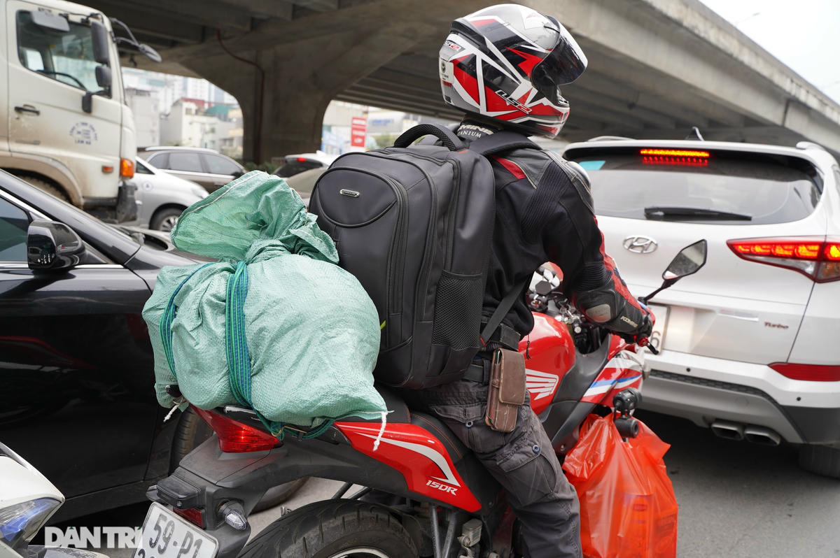 Xe máy chở lỉnh kỉnh đồ đạc chằng trước sau xe rời khỏi Thủ đô.