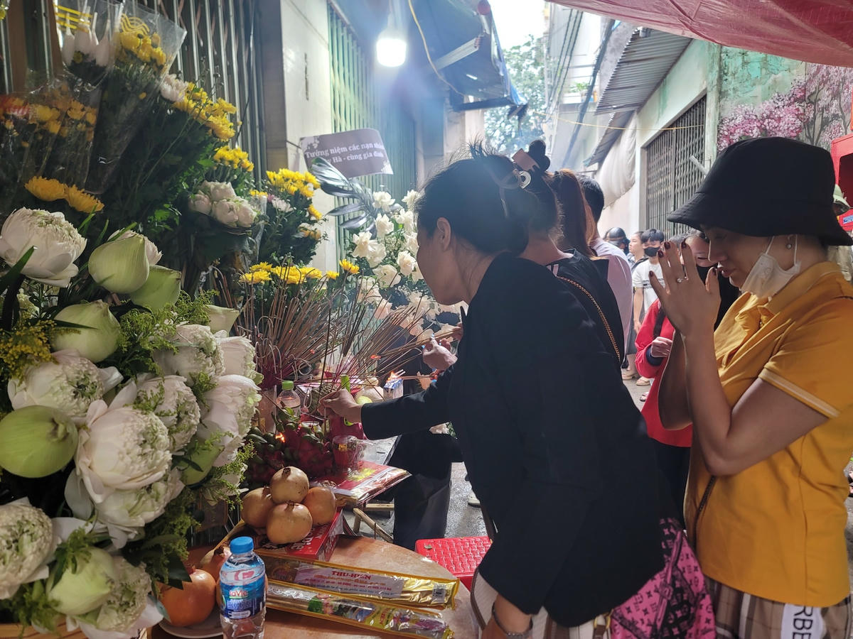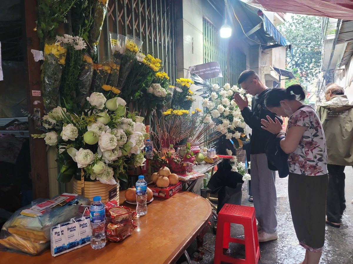 Người dân đội mưa đến chung cư mini bị cháy đặt hoa tưởng niệm các nạn nhân