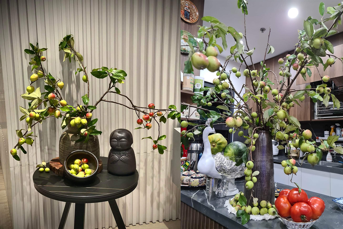 Chị Hà chia sẻ: “Mình biết đến cành táo mèo này là từ một lần đi đến nhà người bạn chơi, thấy họ cắm đẹp quá nên cũng muốn tìm thử để cắm. Khoảng tháng 9 năm ngoái mình cũng cắm thử, lúc đó quả vàng ruộm trông rất đẹp. Năm nay, mình rút kinh nghiệm cắm hẳn lúc sớm như này vừa để được lâu, đến lúc quả sai hái xuống đem đi ngâm làm nước uống là được”.