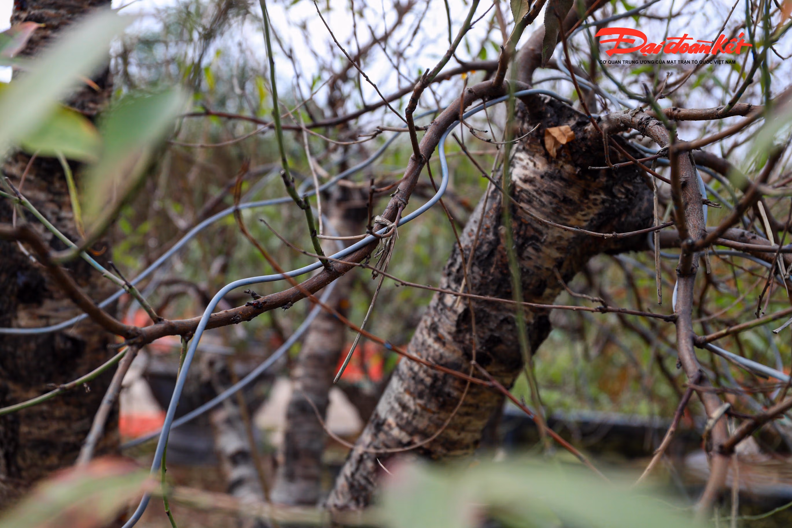 Sau một năm sử dụng các dây thép để uốn cành, giờ đây những cây đào Nhật Tân bắt đầu được "cởi trói".