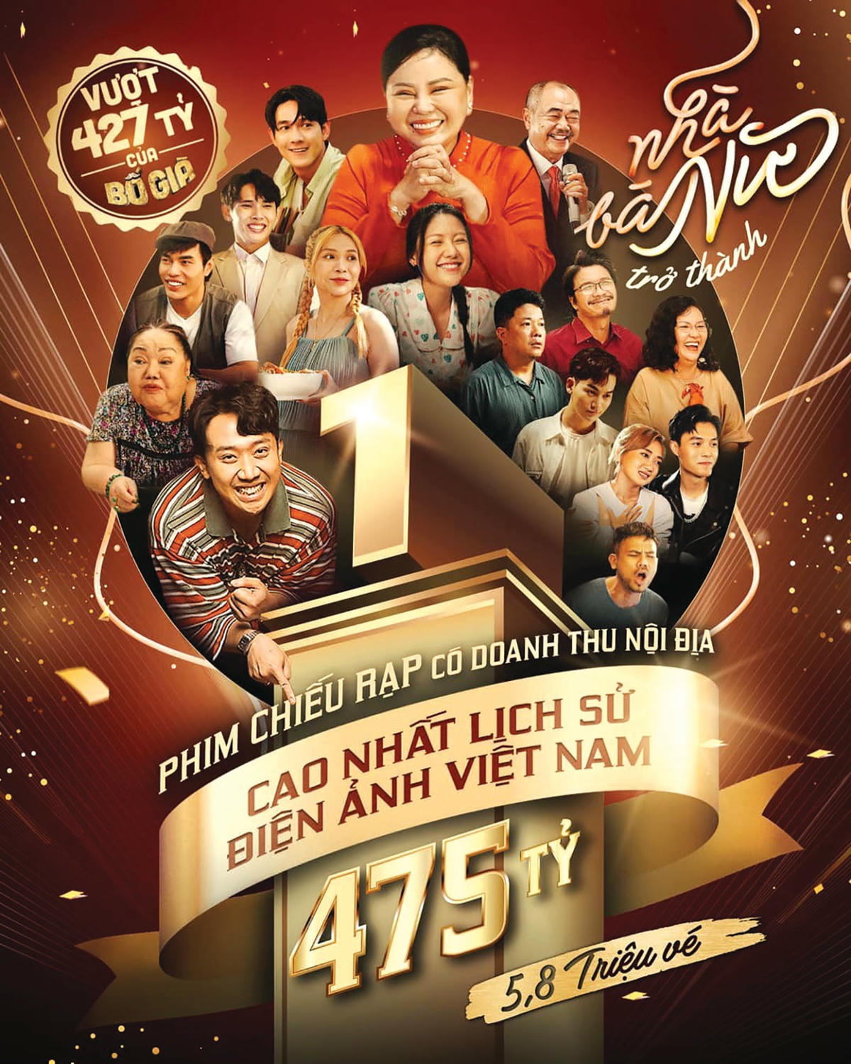 Sau hơn 11 tuần khởi chiếu, phim điện ảnh “Nhà bà Nữ” do Trấn Thành làm đạo diễn kiêm tham gia diễn xuất đã “về đích” với 475 tỷ đồng doanh thu. Thành tích này cũng giúp “Nhà Bà Nữ” trở thành phim chiếu rạp có doanh thu cao nhất lịch sử phòng vé ở Việt Nam. Trên trang cá nhân của mình, Trấn Thành gọi đây là “một điều kỳ diệu, một cột mốc lịch sử” và gửi lời cảm ơn chân thành đến tất cả mọi người. “Trấn Thành xin được gửi lời cảm tạ sâu sắc đến từng thành viên trong dự án này đã cùng Trấn Thành tạo nên một điều kỳ diệu - một cột mốc lịch sử. Đồng thời, chúng tôi vô cùng biết ơn quý vị khán giả vì đã chọn đến rạp ủng hộ cho Nhà bà Nữ để có một kết quả ngoài mong đợi như thế này”, Trấn Thành viết.