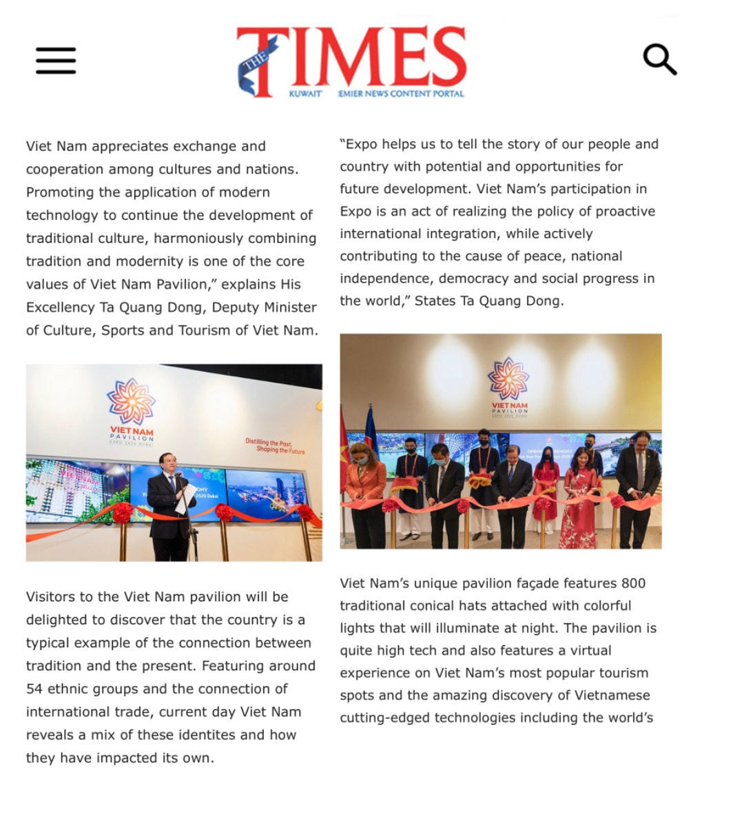 Sự hiện diện của Việt Nam tại EXPO 2020 Dubai đã và đang nhận được nhiều sự chú ý từ truyền thông thế giới. Hơn 100 trang tin quốc tế đã đăng tải tin và hình ảnh về Lễ Khai trương Nhà Triển lãm. Hãng thông tấn Kuwait News phỏng vấn độc quyền Thứ trưởng Bộ Văn hóa, Thể thao và Du lịch PGS. TS Tạ Quang Đông; hãng tin tức Sky News mời Phó Đại diện Việt Nam tại EXPO ông Trần Nhất Hoàng tham gia chương trình tin tức buổi sáng phát sóng trực tiếp tới hơn 50 triệu hộ gia đình tại khu vực Trung Đông và Bắc Phi.