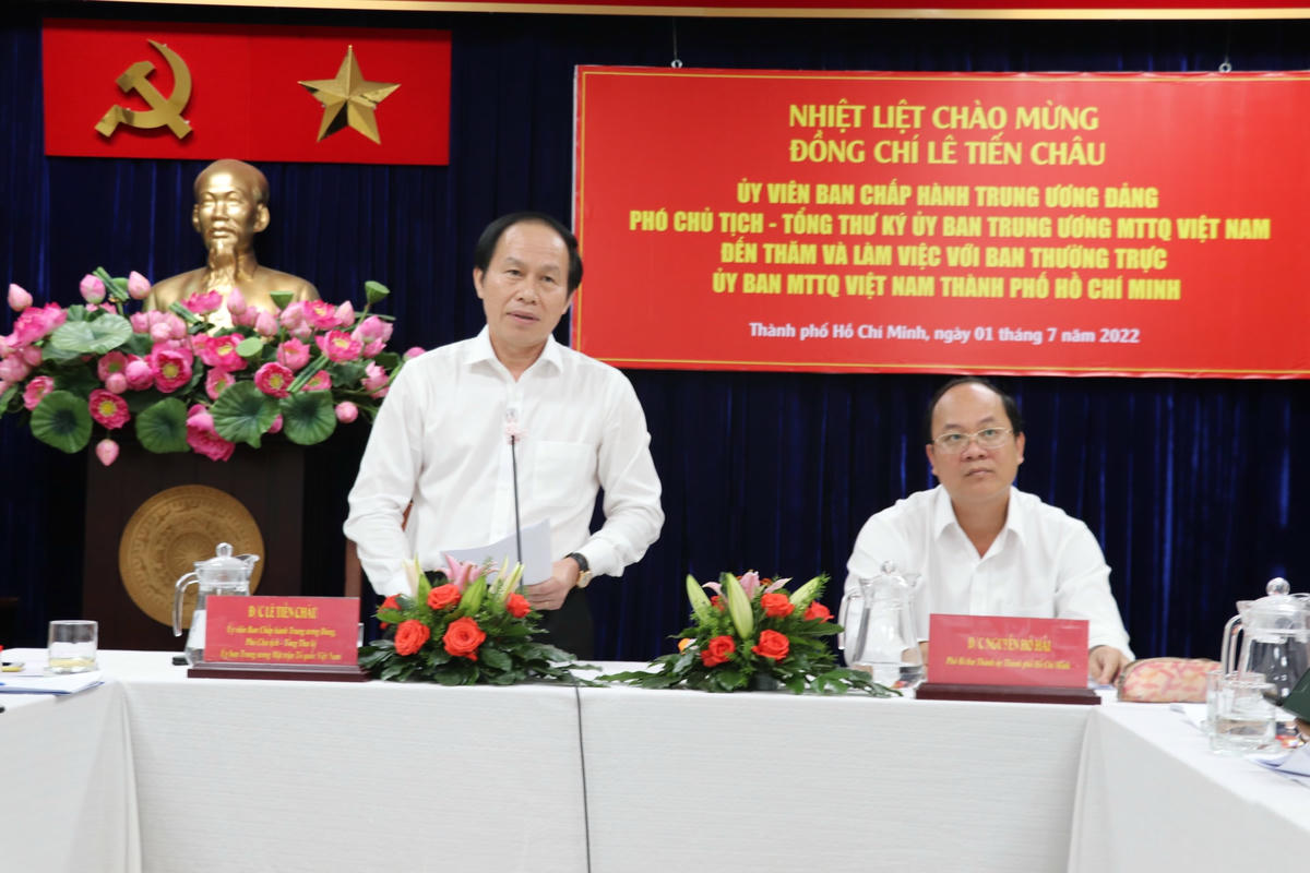 Chiều 1/7, đoàn công tác do ông Lê Tiến Châu, Ủy viên Trung ương Đảng, Phó Chủ tịch - Tổng Thư ký UBTƯ MTTQ Việt Nam làm trưởng đoàn đã có buổi làm việc với Ban thường trực Ủy ban MTTQ Việt Nam TP HCM về tình hình tổ chức, hoạt động của MTTQ Việt Nam thành phố.