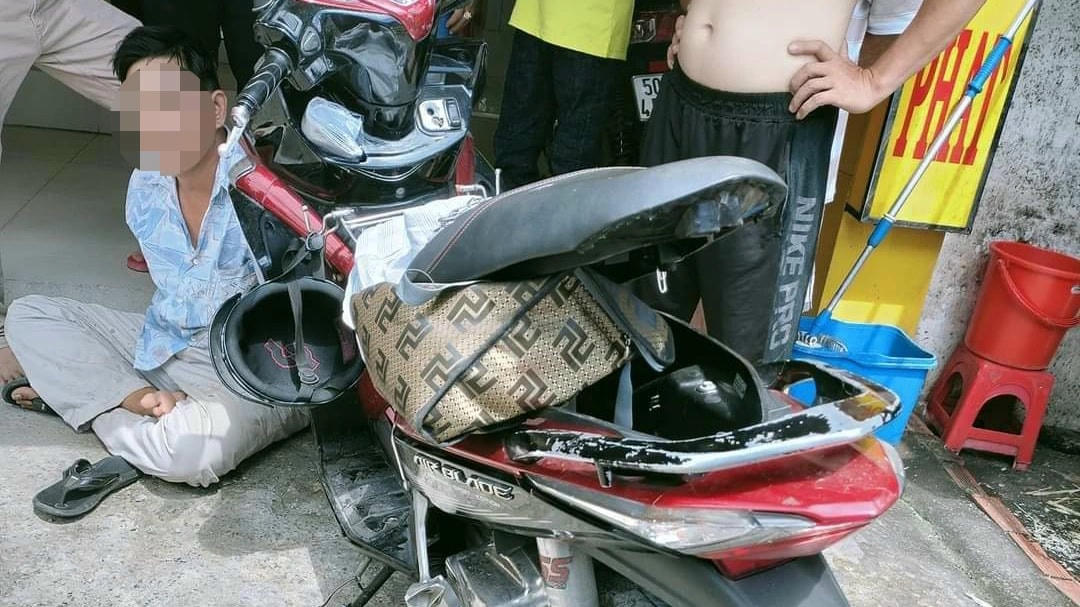 Nghe tiếng xe máy ngã, một người dân ở cạnh bên chạy ra hỗ trợ, khống chế kẻ gian và thu hồi dây chuyền.