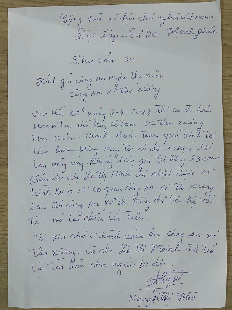 Nhận lại được tài sản của mình, chị Hà rất cảm kích, xúc động và viết thư cảm ơn đến Công an xã Thọ Xương, Công an huyện Thọ Xuân.