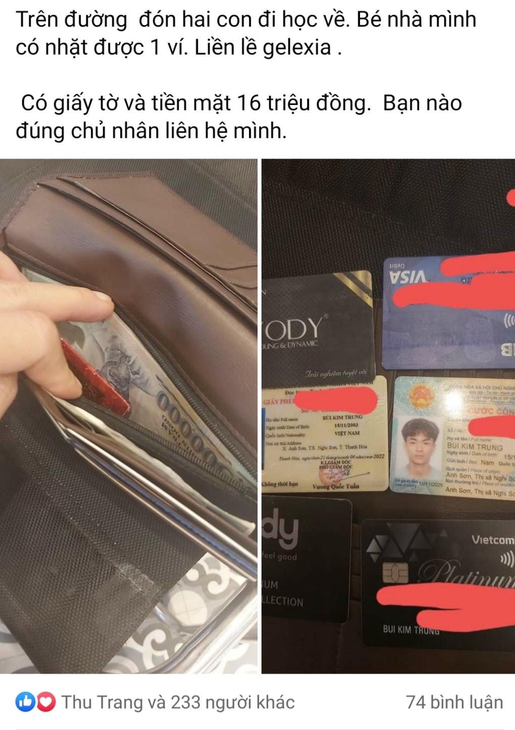 Sau khoảng 2 giờ đồng hồ chia sẻ, chủ nhân của chiếc ví đã liên hệ với chị Dung để xin nhận lại tài sản đánh rơi. Chủ nhân của chiếc ví là Bùi Kim Trung (Thị xã Nghi Sơn, Thanh Hóa) trên đường đến nhà cô chơi không may làm rơi. Trung đã đọc đúng số tiền, các giấy tờ quan trọng đựng trong chiếc ví. Đồng thời là chủ nhân đứng tên các giấy tờ đựng trong ví.