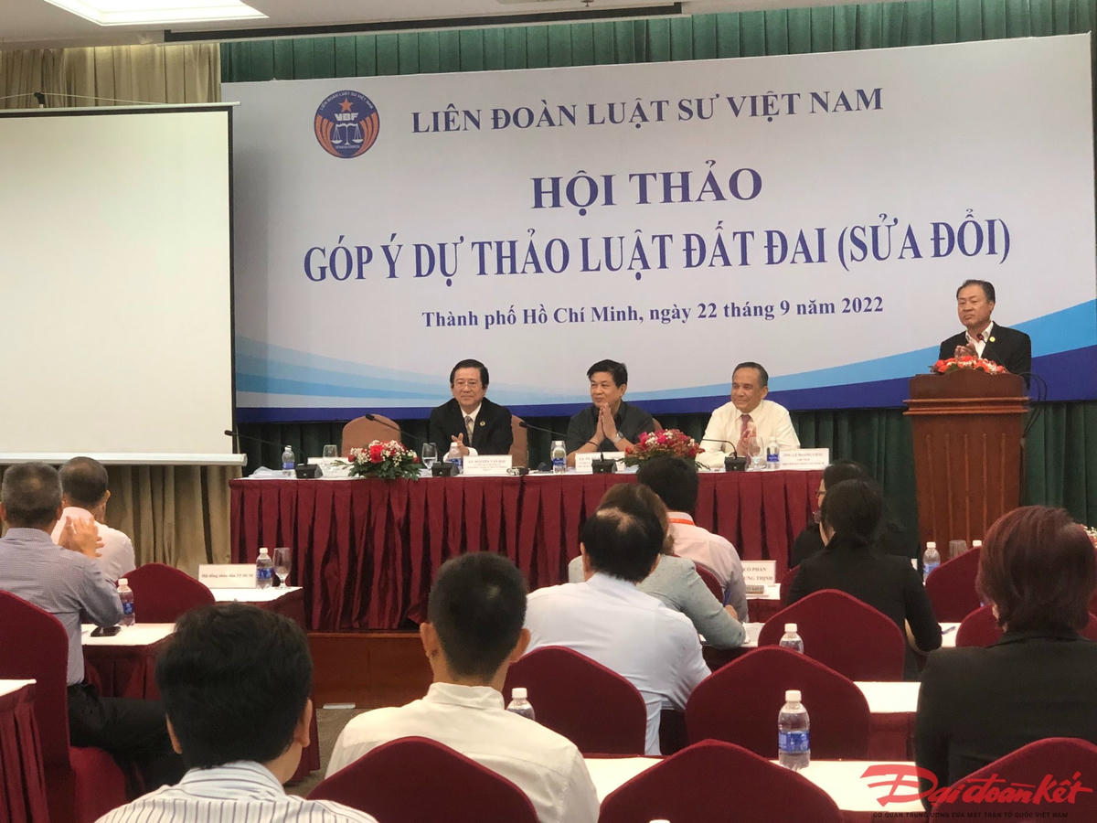 Ngày 22/9, tại Nhà khách Quốc hội phía Nam, Liên đoàn Luật sư Việt Nam tổ chức Hội thảo góp ý Dự thảo Luật Đất đai (sửa đổi), với sự tham dự của gần 100 luật gia, luật sư, chuyên gia về đất đai, bất động sản và đại diện các cơ quan quản lý nhà nước về đất đại của TP HCM và một số địa phương phía Nam.
