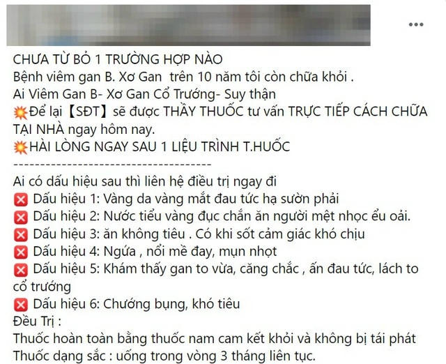 Trên các trang mạng xã hội, điển hình như Facebook hay Youtube, không khó để tìm thấy các bài quảng cáo về loại thuốc nam có thể chữa dứt điểm viêm gan B, thậm chí là viêm gan B mạn tính chỉ trong vòng vài tháng.