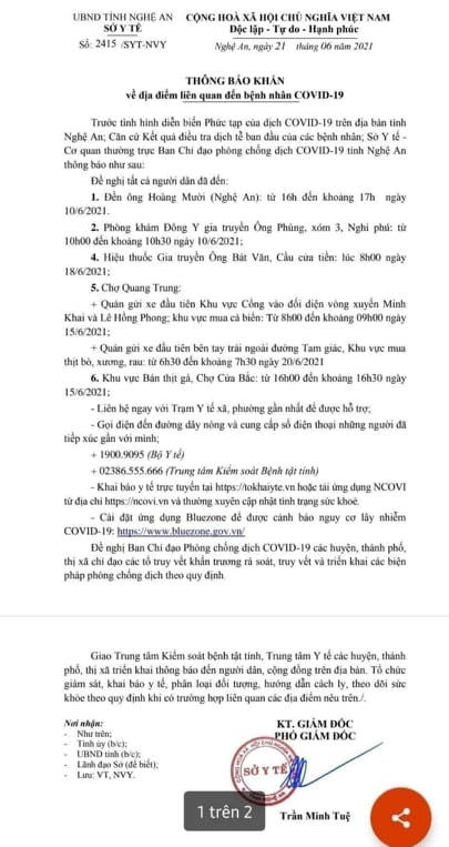Ngày 21/6, Ban Chỉ đạo phòng, chống dịch Covid-19 Nghệ An cho biết, địa phương này tiếp tục phát đi thông báo khẩn tìm người đến các địa điểm liên quan bệnh nhân Covid-19.