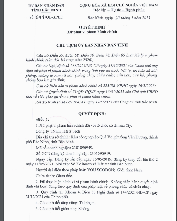 Cùng với hành vi Không chấp hành quyết định đình chỉ hoạt động theo quy định của pháp luật về phòng cháy và chữa cháy, Công ty TNHH H&S Tech (địa chỉ: Khu công nghiệp Quế Võ, phường Vân Dương, thành phố Bắc Ninh, tỉnh Bắc Ninh) bị UBND tỉnh Bắc Ninh xử phạt 90 triệu đồng.