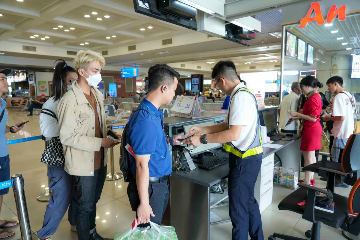 Hành khách sử dụng VNeID để làm thủ tục check-in tại quầy thủ tục để nhân viên An ninh hàng không kiểm soát giấy tờ đi máy bay trước khi vào khu vực soi chiếu an ninh hàng không. Những hành khách sử dụng VNeID không gặp khó khăn, trở ngại nào trong chuỗi làm thủ tục.