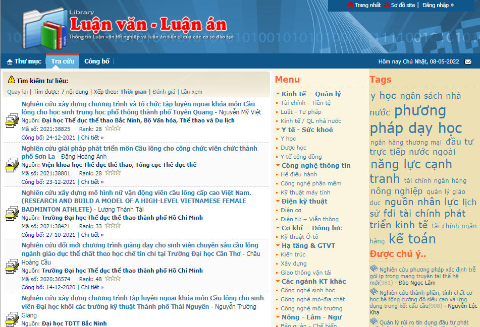 Trong đó, có một số đề tài có tiêu đề gần giống nhau như: “Nghiên cứu xây dựng chương trình và tổ chức tập luyện ngoại khóa môn cầu lông cho học sinh trung học phổ thông thành phố Tuyên Quang" của tác giả Nguyễn Mỹ Việt; đề tài “Nghiên cứu xây dựng chương trình tập luyện ngoại khóa môn cầu lông cho sinh viên Đại học khối các trường kỹ thuật thành phố Thái Nguyên" của tác giả Nguyễn Trường Giang...