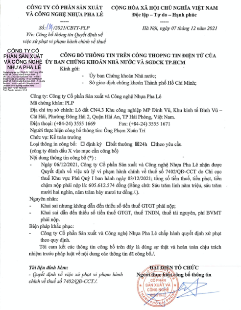 Cục Thuế tỉnh Nghệ An mới ban hành quyết định xử phạt vi phạm hành chính về thuế đối với Công ty Cổ phần Sản xuất & Công nghệ nhựa Pha Lê (MCK: PLP) – chi nhánh Nghệ An.