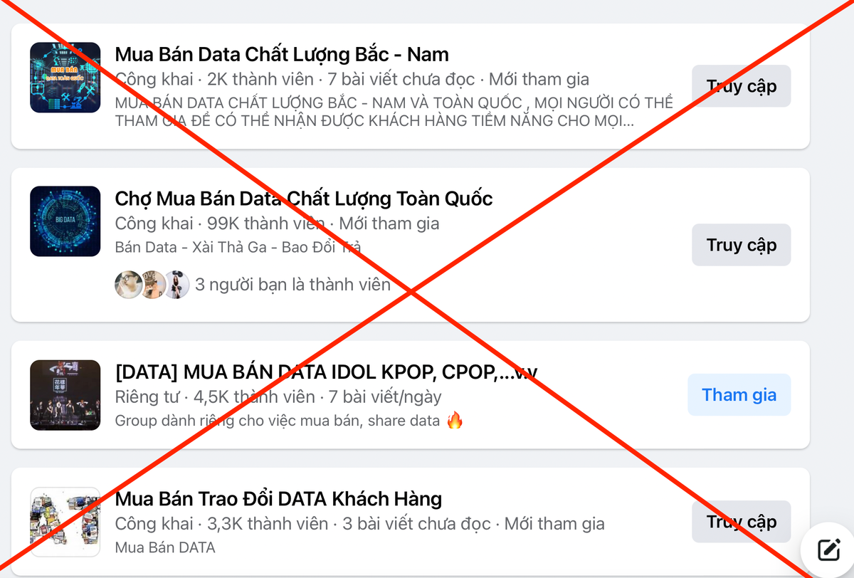 Trên mạng xã hội, nhiều hội nhóm từ công khai đến bí mật đều ngang nhiên rao bán thông tin dữ liệu cá nhân với số lượng thành viên lớn. Theo đó, hàng chục bài viết được đăng tải mỗi ngày trên các hội nhóm này liên quan đến việc tìm data khách hàng trên nhiều lĩnh vực, ngành nghề và khu vực trên cả nước.