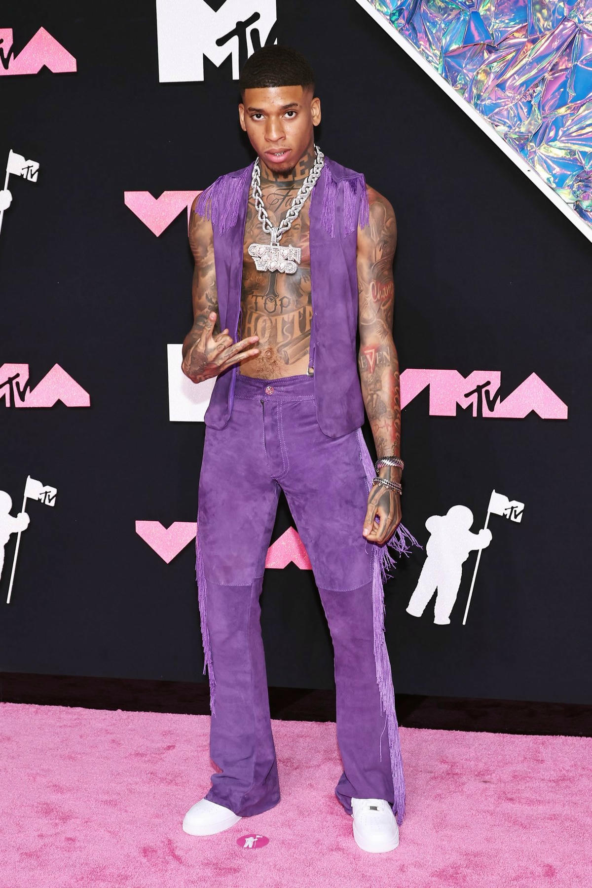 NLE Choppa theo đuổi phong cách cao bồi sang trọng với bộ đồ hai mảnh bằng da lộn có tua rua màu tím và một chiếc vòng cổ có dây chuyền "Cotton Wood" đính đá quý.