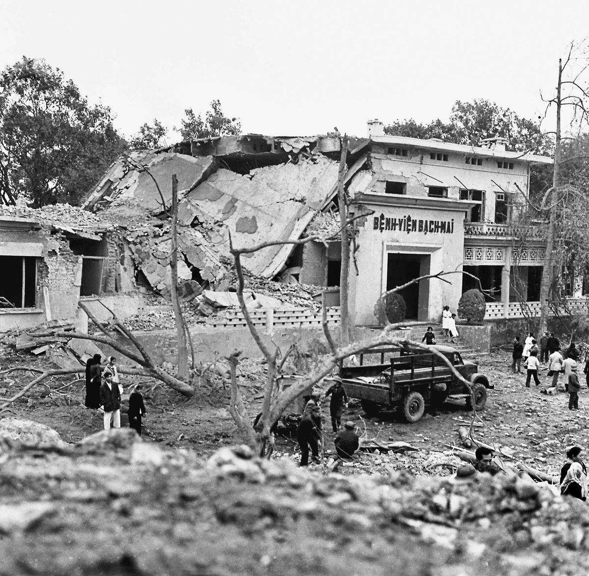 Tôi đứng trước bệnh viện mà lòng cảm thấy đau nhói. Bệnh viện Bạch Mai bị sập xuống mấy dãy nhà, hố bom sâu hoắm trước cổng, cán bộ bệnh viện, dân phòng, dân quân tự vệ, công an đã bắt đầu thu dọn đống đổ nát. Tôi chụp được ảnh toàn cảnh bệnh viện sau trận bom. Sau đó tôi đi đến chỗ hầm bị sập, mọi người đang tháo gỡ từng tảng xi măng, cục gạch, tấm thảm bông để lấy không khí cho người ở dưới thở, sau rồi mới đưa lên. Chứng kiến cảnh tượng đó phải chắc tay, kiềm lòng lắm tôi mới hoàn thành được nhiệm vụ.
