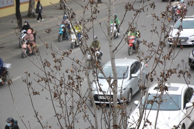 Những ngày gần đây, nhiều cây phong lá đỏ trên đường Trần Duy Hưng, Nguyễn Chí Thanh có dấu hiệu rụng lá, chết khô, thậm chí có vài cây bị nứt toác thân khi trời chuyển sang đông.