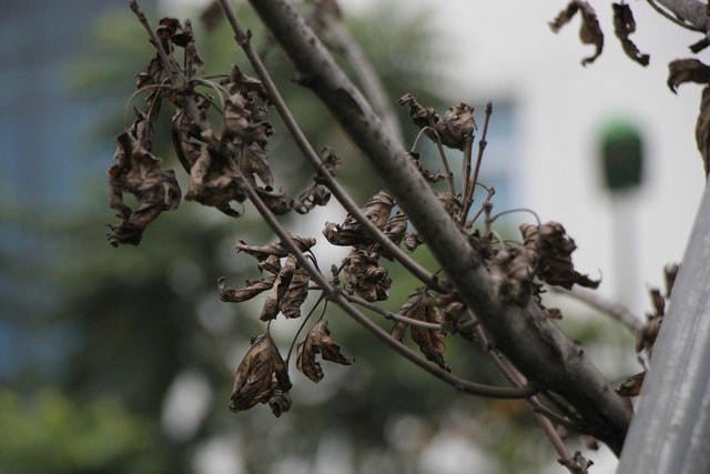 Những cây phong lá đỏ khô héo, nứt toác trên đường phố Hà Nội