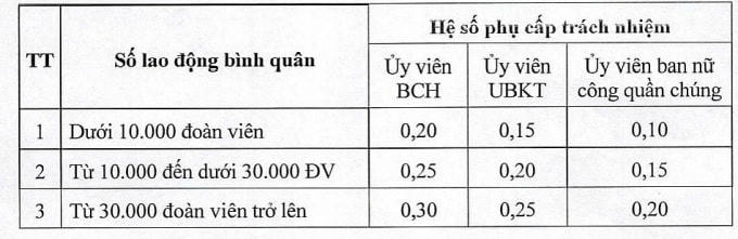 Hệ số phụ cấp trách nhiệm đối với cán bộ công đoàn cấp tỉnh, cấp Trung ương và tương đương được xác định theo số lao động tham gia bảo hiểm xã hội bình quân để làm căn cứ trích nộp kinh phí công đoàn trong đơn vị quản lý của năm trước. Theo đó, số lao động bình quân dưới 300.000 đoàn viên thì hệ số uỷ viên ban chấp hành là 0,40, ủy viên uỷ ban kiểm tra là 0,30. Từ 300.000 đoàn viên trở lên thì hệ số phụ cấp trách nhiệm của ủy viên ban chấp hành là 0,45 và ủy viên ủy ban kiểm tra là 0,35