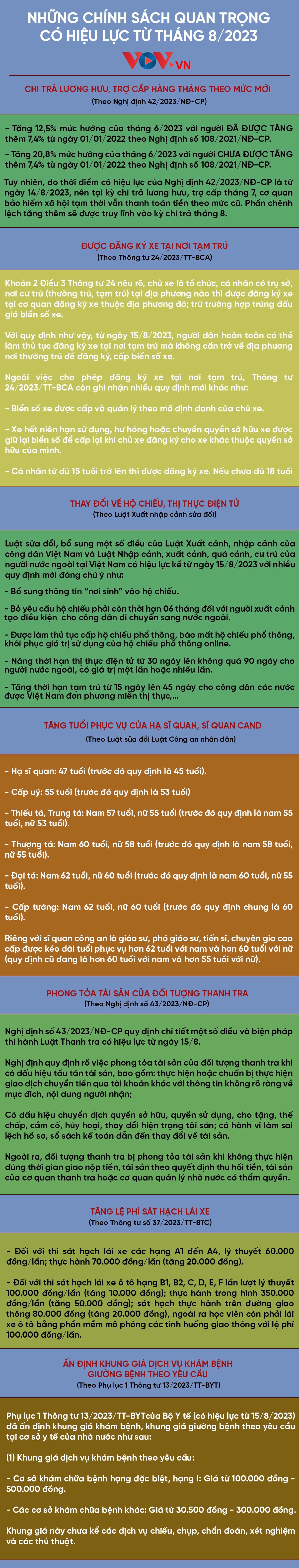Trong tháng 8/2023, nhiều chính sách mới có hiệu lực, như các chính sách về điều chỉnh tiền lương hưu, trợ cấp bảo hiểm xã hội và trợ cấp hằng tháng, đăng ký xe...